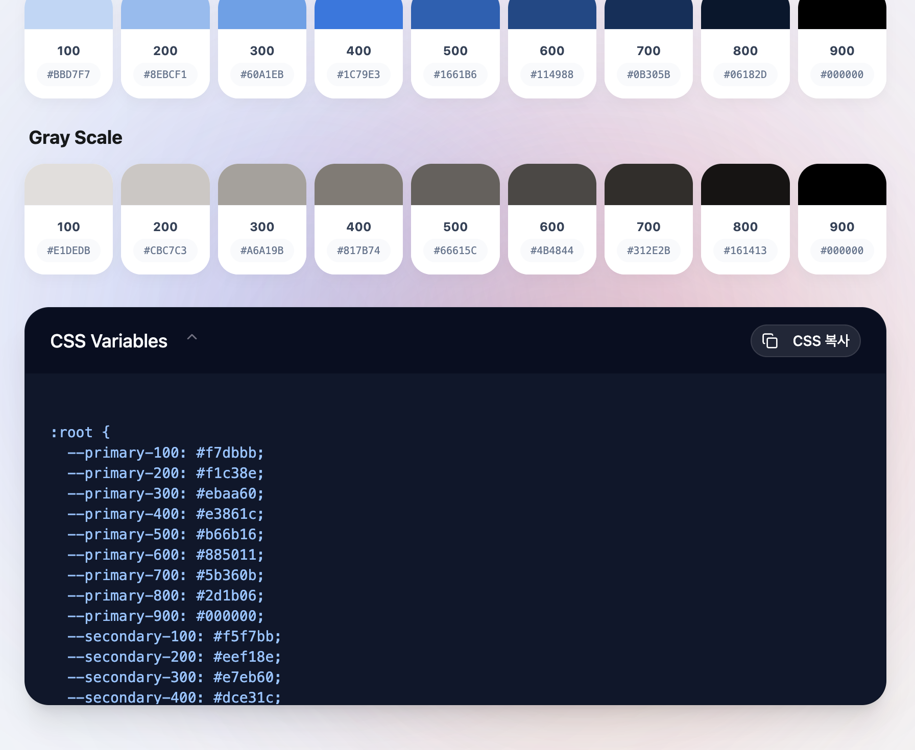 색상을 추천해주는 서비스는 많았지만, 추천에 기반한 색상을 사용하고 싶지 않았다. 제가 직접 색상을 선택하고, 그 색상들로 시스템이 자동 생성됐으면 했다.