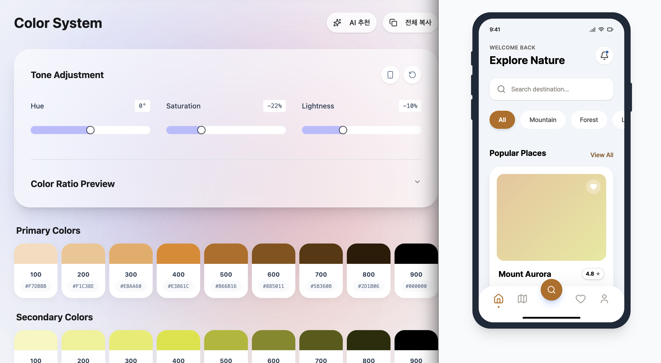 Color Hex 코드만 입력하면 결과 기반 색상 시스템이 자동 생성된다.
